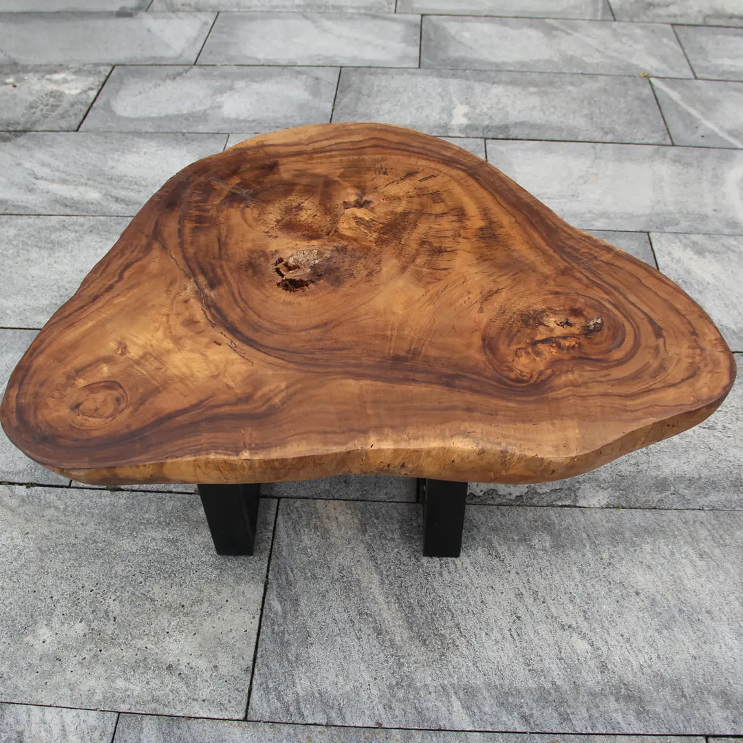 Baumscheibe Couchtisch aus massivem Akazien-Suarholz – für alle, die einen schmutzabweisenden Holzstammtisch 90 cm für Wohnzimmer oder Lounge in der Schweiz suchen. Die ca. 8 cm starke Baumscheibe mit dreieckiger Naturform passt ideal vor L-Sofa, einseitige Sofakombination oder offene Wohnlandschaft und bietet genug Fläche als Kaffeetisch. Naturbelassen geschliffen, ohne Lack, ohne Öl – hartes, pflegeleichtes Hartholz statt empfindlicher Furnierplatte. Schwarze Metallbeine sorgen für Stabilität im Alltag. Perfekt für Suchanfragen wie Baumscheibe Tisch kaufen, Baumstamm Salontisch Zürich, Holzstammtisch rustikal, asiatischer Couchtisch Suarholz oder Massivholz Wohnzimmertisch online bestellen und im Showroom Feuerthalen testen.